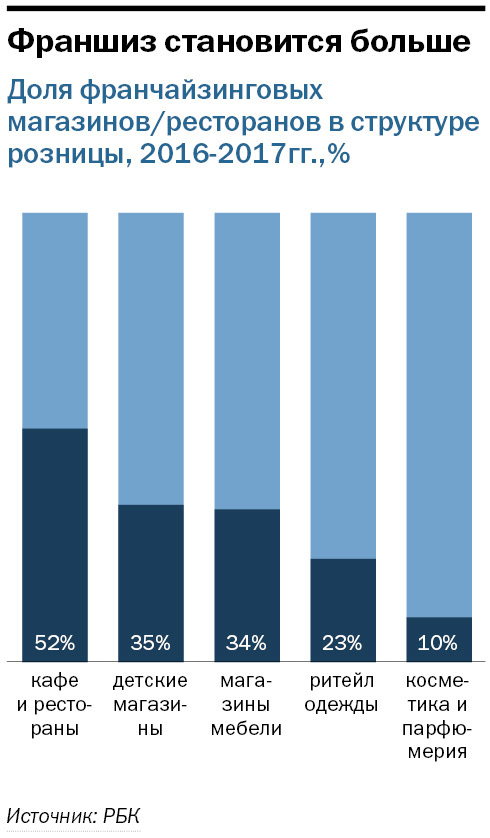 Наиболее развитым с точки зрения проникновения франчайзинга, по результатам исследования РБК, проведенного в марте 2017 г., является рынок общественного питания. Здесь 52% сетевых ресторанов и кафе работают по системе франчайзинга. Рынок детских магазинов на 35% состоит из франшиз, мебели — 34%. Проникновение франчайзинговой модели в одежном ритейле — 23%, на рынке DIY— 17%. Наименьшая доля франчайзинговых магазинов наблюдается на рынке косметики и парфюмерии, всего 10%.