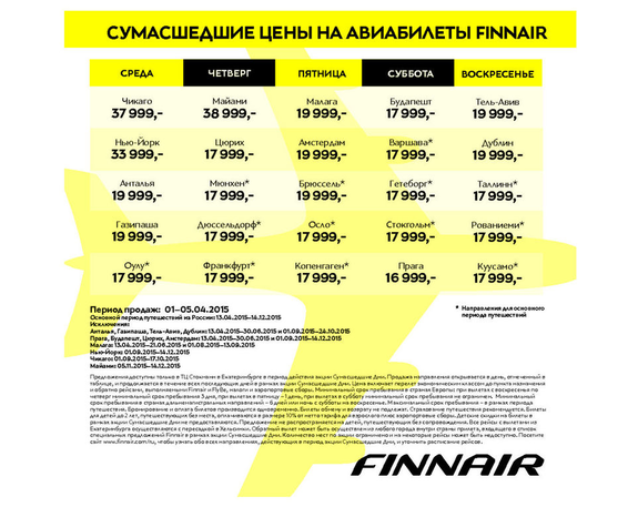 С 1 по 5 апреля в магазинах финской сети Stockmann пройдет традиционная акция «Сумасшедшие дни». В ее рамках устроят распродажу и авиабилетов компании Finnair. В этот раз перевозчик вместе с рейсами в Европу представил также несколько американских направлений, однако цены на билеты выросли примерно на 60%. Если весной 2014 г. самый дешевый перелет стоил 10499 руб., то теперь — 16 999 руб. За такую сумму можно будет слетать в Прагу. Другие рейсы дороже: к примеру, Амстердам, Дублин, Тель-Авив стоят от 19 999 руб., а трансатлантические рейсы — от 33 999 руб. в Нью-Йорк.