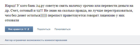 В ночь на 11 сентября прошла волна слухов об отзыве лицензии у Банка24.ру, которые в очередной раз не подтвердились. В финучреждении подчеркивают: «Не дождетесь».