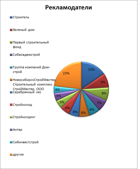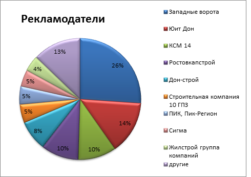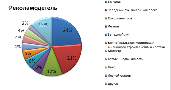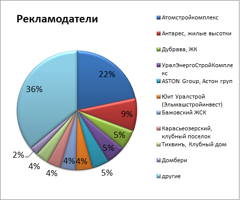 В 2012 году Челябинск стал лидером по вводу жилья среди городов присутствия «ДК», увеличив объем строительства более чем в два раза с 2010 года (см. Таблица 2) и к 2011 составила 67%. Примерно теми же темпами росли рекламные затраты застройщиков Челябинска (см. Таблица 3). Другие города продемонстрировали не столь впечатляющий рост строительства, там динамика ввода жилья составила в пределах 10 % за 2010 и 2011 гг, кроме Н. Новгорода, динамика которого к 2011 составила 53 %. В Казани, Красноярске немного замедлились темпы строительства на по сравнению с 2010 и 2011 годом, Екатеринбург отстал от рекорда 2011 на 15 %. При этом рекламные бюджеты не сократились ни в одном из городов. Более того, в Казани они увеличились практически более чем в два раза. Лидерами по объему рекламных инвестиций на один квадратный метр в 2012 году стали Екатеринбург, Красноярск и Н. Новгород (см. Таблица 4). В Екатеринбурге более половины рекламных бюджетов застройщиков получила пресса, в Красноярске и Нижнем Новгороде лидирующим медиа стало телевидение. В Челябинске 70% всех бюджетов ушло на радио!