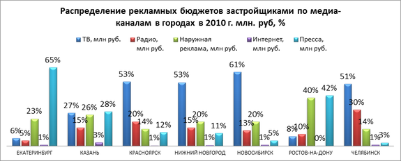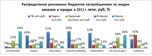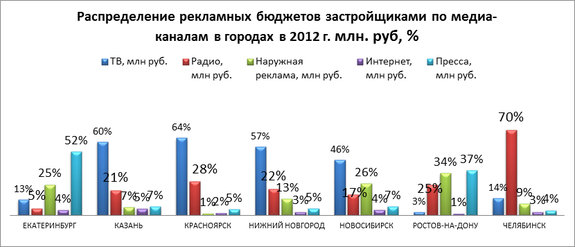 Традиционными каналами для рекламы новой недвижимости по данным мониторинга РГ Deltaplan в 2010-2012 гг. выступали ТВ площадки, за исключением Екатеринбурга и Ростова–на-Дону – где мощным каналом является печатная пресса и наружная реклама, а также Челябинска – где конкурным каналом размещения рекламы новой недвижимости ТВ стало радио.