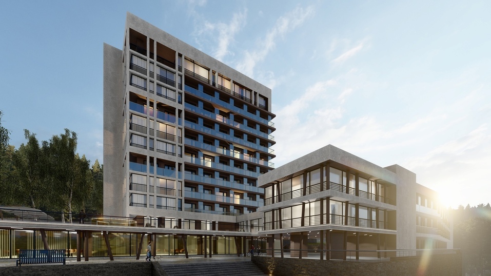 Конечно же, появится и сам термальный комплекс, а также водные аттракционы и обустроенный пляж. Общая площадь будущего комплекса составит 14 га. Существующие на площадке здания компания реконструирует, а инженерные сети — меняет. В уже существующем 11-этажном корпусе с панорамным рестораном на верхнем этаже инженерные сети протянуты до 10 этажа, а в некоторых номерах уже сделана чистовая отделка. В ближайших планах — строительство нового 10-этажного корпуса с бассейном на крыше.