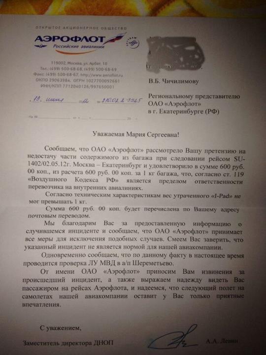Аэрофлот заплатит 600 руб за украденный в Екатеринбурге IPad/СКАН