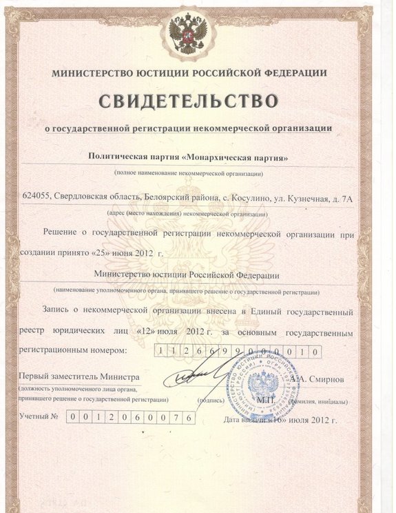 О регистрации партии в минюсте Антон Баков сообщил на своей странице в Facebook. Штаб-квартира «Монархической партии» будет находиться на улице Кузнечной в селе Косулино. По некоторым данным, там у свердловского политика имеется недвижимость.