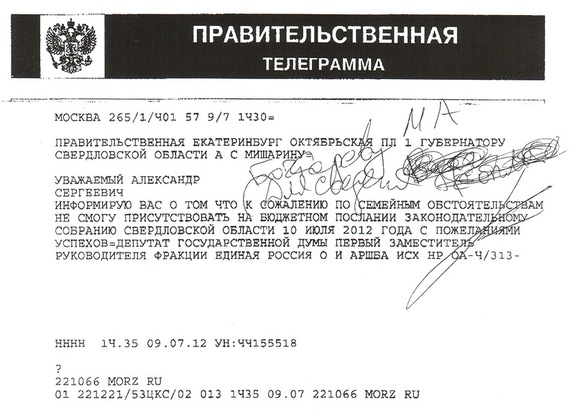 Депутат госдумы Отари Аршба прислал свердловскому губернатору телеграмму с извинениями за то, что не смог присутствовать на сегодняшнем бюджетном послании. Правда, в тексте он допустил досадную ошибку