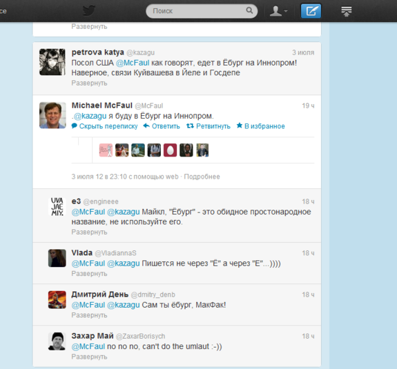 Посол США в РФ Майкл Макфол сообщил в своем твиттере, что «будет в Ёбург на Иннопром». Возмущенные свердловчане тут же указали послу на ошибку. Он обещал больше не использовать незнакомых русских слов