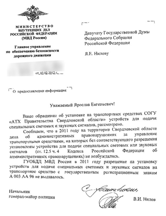 «Как следует из ответа чиновника, ГУОБДД МВД России соответствующего разрешения на автомобиль с номером А003АА96 не выдавало. А следовательно, мигалка на машине, обслуживающей губернатора Свердловской области, была установлена незаконно», - сообщает пресс-служба ЛДПР.