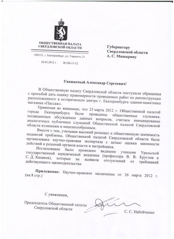 Администрация Екатеринбурга не прекращает публиковать документы, связанные с реконструкцией «Пассажа». Сегодня на сайте ekburg.ru появилась копия письма Общественной палаты Свердловской области, направленное губернатору Мишарину.