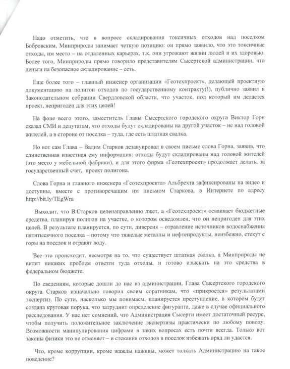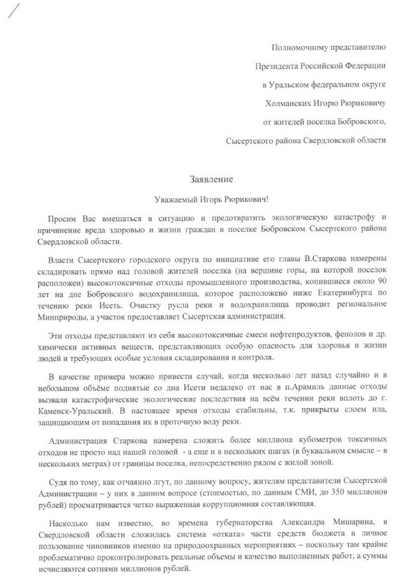 Жители поселка Бобровский в Свердловской области направили письмо в полпредство в УрФО. Свердловчане предупредили Игоря Холманских о возможной экологической катастрофе в поселке.