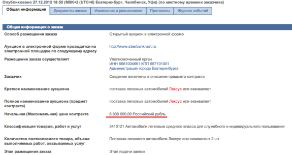 Напомним, аукцион пройдет 21 января. Начальная сумма контракта составляет 8,8 млн руб. Заказчиком выступает администрация Екатеринбурга. По условиям заказа, автомобили должны быть не старше 2012 года, в них должны быть кожаные кресла, ионизатор воздуха, круиз-контроль и многое другое.