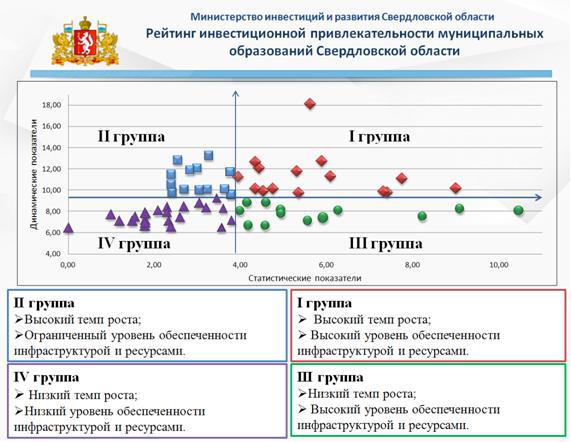 Рейтинг инвестпривлекательности муниципалитетов необходим для определения конкурентных преимуществ конкретных территорий Свердловской области. Методом создания этого рейтинга является разделение муниципалитетов на группы по степени роста и развитости инфраструктуры.