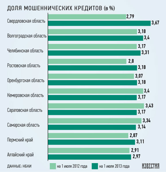 По данным на 1 июля 2013 года доля мошеннических кредитов в Свердловской области составила 3,67%, тогда как еще год назад этот показатель равнялся 2,79%. С этими цифрами регион не входил даже в десятку лидеров рейтинга НБКИ. На втором месте списка оказалась Волгоградская область (3,18%), на третьем - Челябинская (3,17%).
