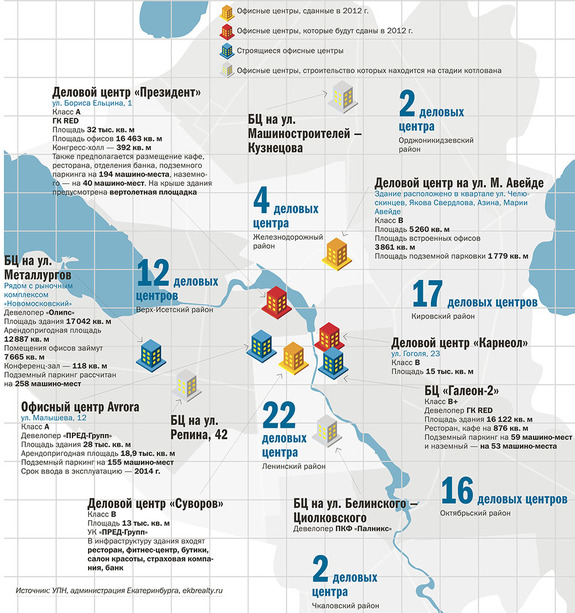 В 2011 г. рынок коммерческой недвижимости Екатеринбурга пополнился 280 тыс. кв. м. новых офисных площадей – девелоперы ввели в эксплуатацию семь бизнес-центров. Годом ранее был сдан лишь один. При этом, по данным горадминистрации, с начала 2012 г. уже сданы БЦ «Манхеттен» и «Филитц», а также «Суворов» и деловой центр на ул. М. Авейде – и число офисников в Екатеринбурге достигло 75. «В течение года должны открыться БЦ «Карнеол» и «Президент» - тогда площадь объектов превысит 1061,9 тыс. кв. м.», - сообщил зампред комитета бытового обслуживания населения мэрии Олег Китаев. Он добавил, что вакантно на сегодня 20-30% офисных площадей.