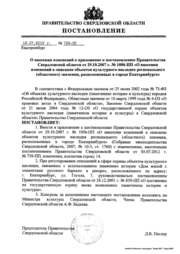 Постановление об исключении особняка «с элементами русского барокко в декоре» было принято 17 июня 2012 года. Подпись под документом поставил Денис Паслер.
