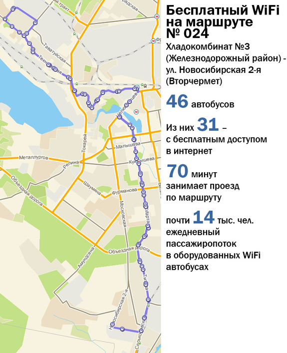 Бесплатно зайти в интернет смогут пассажиры автобуса № 024 (Хладокомбинат №3 - ул. Новосибирская 2-я). WiFi-модули для перевозчика ООО «ПЕГАС» установила компания ОАО «ВымпелКом».