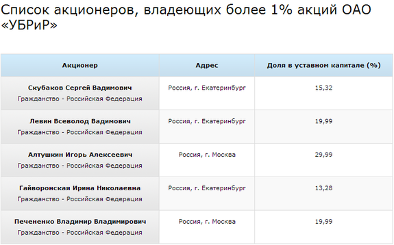 Уведомление об изменениях состава акционеров ОАО «УБРиР» сегодня появилось гна сайте банка. Как уточняется в сообщении, Надежда Храмова продала свою долю остальным совладельцам банка, и теперь список акционеров, владеющих более 1%, выглядит следующим образом: Игорь Алтушкин (29,99%), Владимир Печененко (19,99%), Всеволод Левин (19,9989%), Сергей Скубаков (15,316%) и Ирина Гайворонская (13,28%).