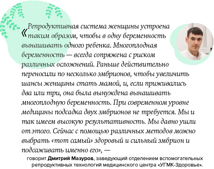 Кроме того, при необходимости пары старшего репродуктивного возраста могут воспользоваться программами донорства, которые есть, к примеру, все в том же Центре семейной медицины. Сейчас в клинике — самый большой на Урале банк репродуктивного биологического материала.