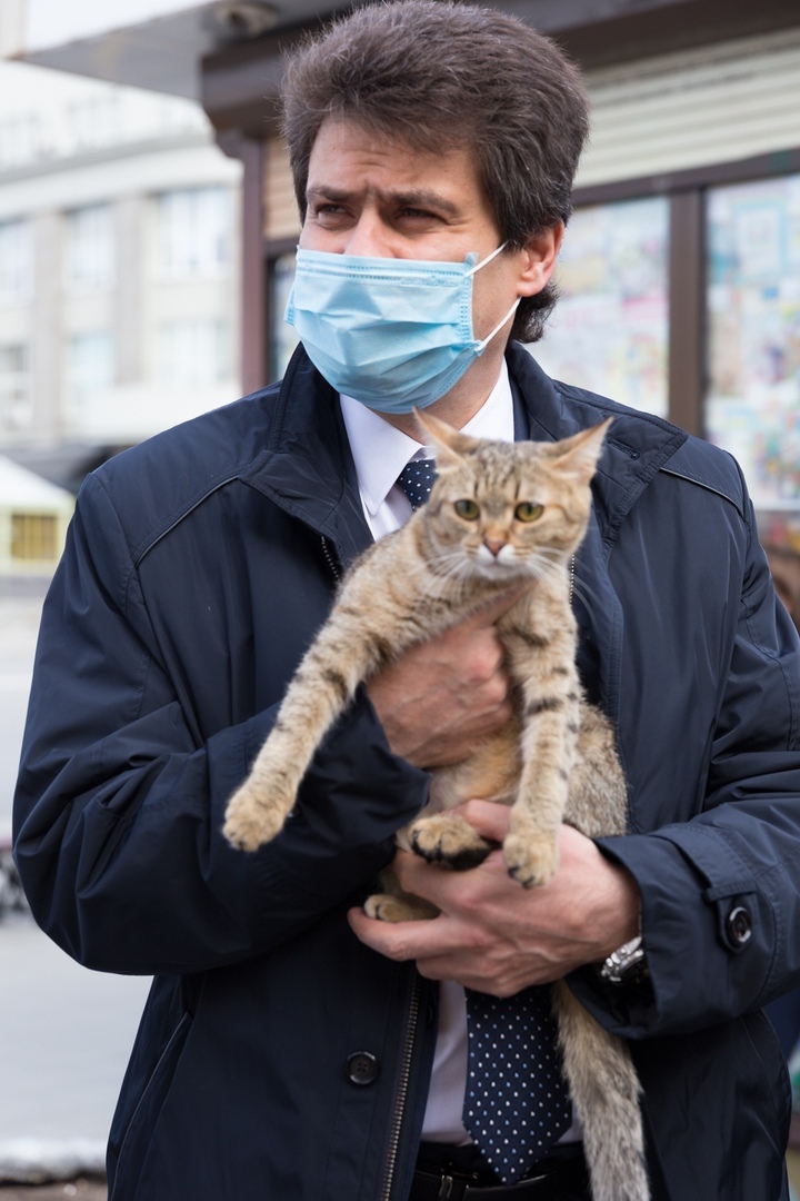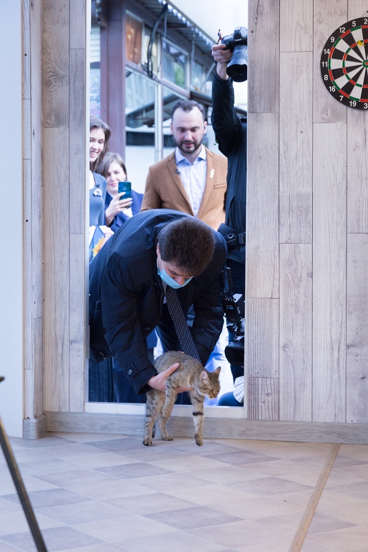 Первым гостем нового дома телекомпании стал мэр города Александр Высокинский. По доброй традиции, он запустил внутрь студии кошку по кличке Кнопка.