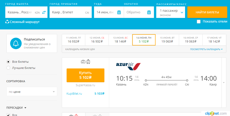 Цены на билет из Екатеринбурга в Каир начинаются от 10 тыс. руб. (в одну сторону). Из других городов полеты могут быть еще дешевле. Так, сейчас купить билет из Казани до столицы Египта на середину июня можно чуть дороже чем за 5 тыс. руб.