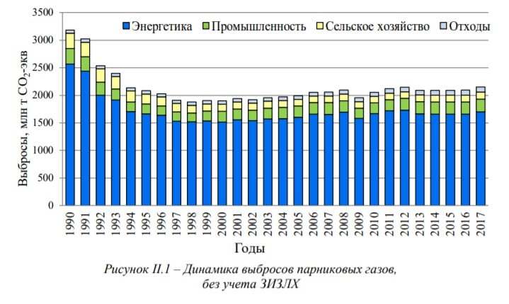 Динамика выбросов России с 1990 по 2017 гг.