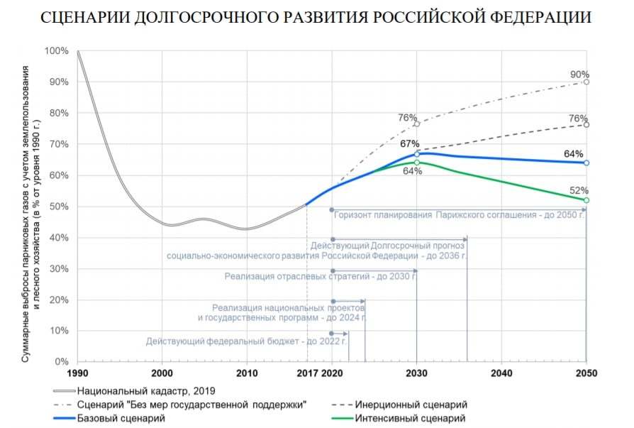 7 | Когда Россия собирается стать углеродно-нейтральной тоже непонятно. Стратегии у нас нет. В начале 2020 г. Минэкономразвития подготовило проект «Стратегии долгосрочного развития с низким уровнем выбросов парниковых газов до 2050 года». Дак там даже в оптимистичном сценарии мы к 2050 г. будем примерно на том же уровне выбросов, что и сейчас, а углеродная нейтральность ожидается ближе к концу XXI века. Даже у коптящего, как паровоз, Китая, с его растущей экономикой стратегия куда амбициознее. Впрочем, полгода назад наш Совет Безопасности эту стратегию завернул и отправил на доработку. Посмотрим, в какую сторону ее поправят. Почему вообще СБ занимается оценкой таких стратегий — отдельный вопрос.