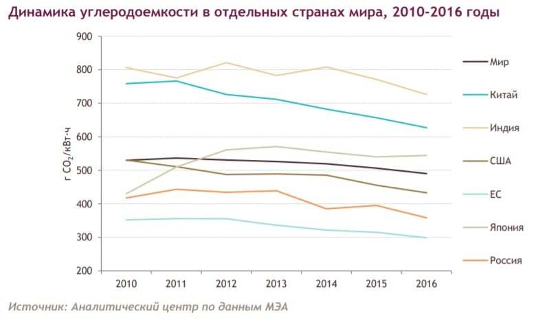 Россия действительно больше всех сократила выбросы от уровня 1990 г., но в результате той самой «величайшей геополитической катастрофы», выражаясь словами самого Путина, т. е. развала СССР, когда рухнула экономика, а за ней и выбросы. А с тех пор выбросы только очень умеренно росли, падая во времена новых кризисов. Так что перестройка энергетики, конечно, имела место, но не была решающей в снижении выбросов.