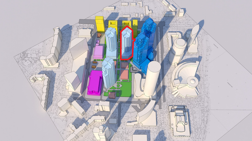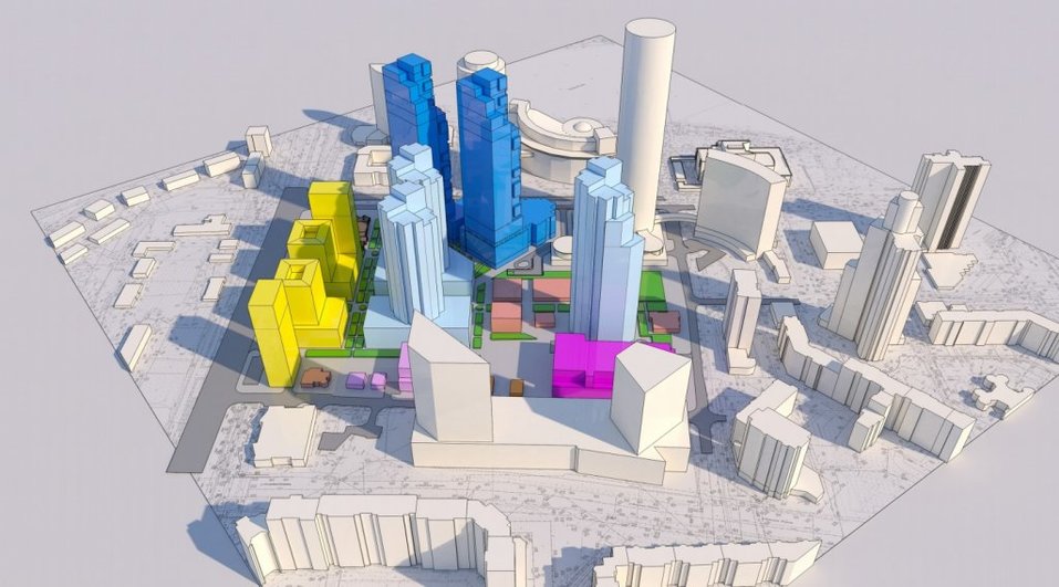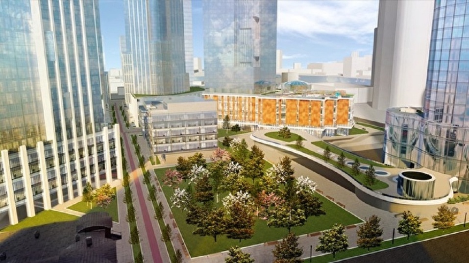Согласно последней концепции, в квартале планируется возвести четыре небоскреба (от 135 до 171 м). Раньше их было пять, но одну высотку решили убрать и разбить на ее месте площадь.