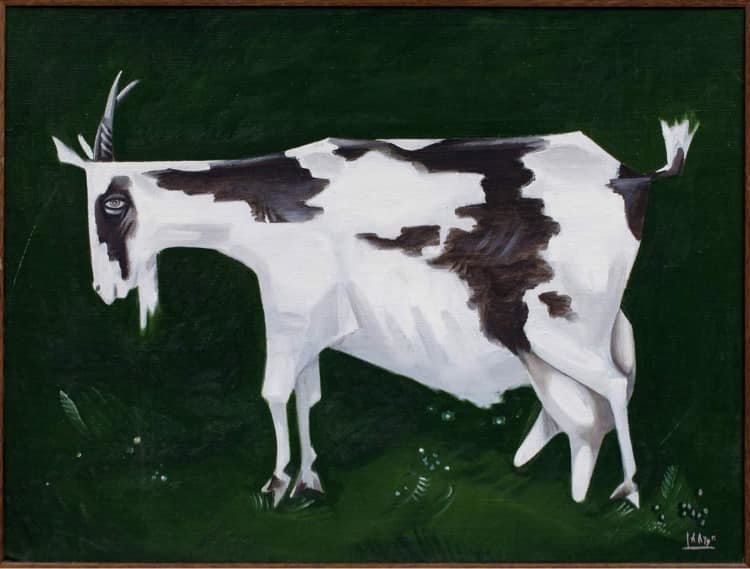 — Продаю козу... У меня пришло время платить штрафы за митинги. 65 тысяч. Платить мне не охота, да и денег у меня нет. А я недавно купил две замечательные картинки знаменитого кузнеца Александры Лысякова. Он раньше был очень крутой художник, и на рынке его работы встречаются крайне редко. А тут просто повезло. Одна работа — известный портрет Старика Букашкина 1976 г. Лучший, я думаю. Я его сегодня подарил Музею Наивного искусства, который я когда-то подарил городу. А вторая работа «Коза», 1978 г., размер 83/64. Вот ее я и хочу продать. 65 тысяч рублей. Стоит она дороже, но мне лишнего не надо.