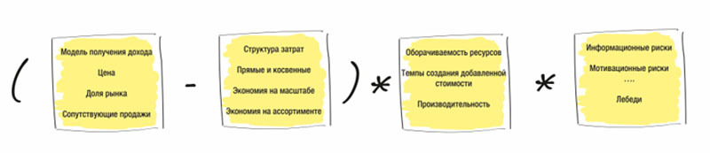Из модели получения дохода «отнимаем» структуру затрат (с учетом инструментов управления издержками), затем умножаем разницу на фактор времени (оборачиваемость ресурсов, темпы создания добавленной стоимости или производительность) и, наконец, вводим влияние рисков (информационных, мотивационных и прочих), умножая на некий понижающий коэффициент (согласитесь, не бывает так, чтобы все и всегда работало как надо).