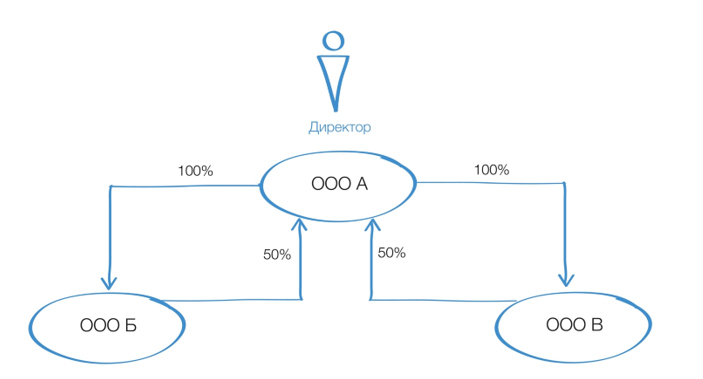 Таким образом, Основатель бизнеса, действуя только как директор ООО А, в итоге контролирует все три компании, вообще не имея долей в их уставных капиталах. На уровне ООО А максимальная компетенция у директора. На уровне ООО Б и ООО В максимальная власть у их единственного участника — ООО А в лице его директора, в том числе принятие решений от их имени как участников ООО А.