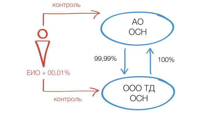 Интересы обеспечения владельческого контроля интуитивно побуждают к взаимному участию компаний 100% на 100%, но такая конструкция запрещена. Причем не только в России, но и во многих популярных юрисдикциях. В том числе и тех, которых традиционно относят к офшорным. Поэтому в состав участников одной из компаний необходимо включить как минимум еще одно лицо, минимальный размер доли которого законом не установлен.