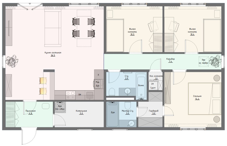 На 100 м2 размещены все необходимые зоны для современной семьи с детьми и домашним питомцем: просторная прихожая, большая котельная с техническим душем, эргономичная кухня-гостиная с выходом на террасу, светлый коридор для разграничения приватной и общественных зон, уютные детские комнаты, полноценная мастер-спальня со своей гардеробной и отдельным санузлом.