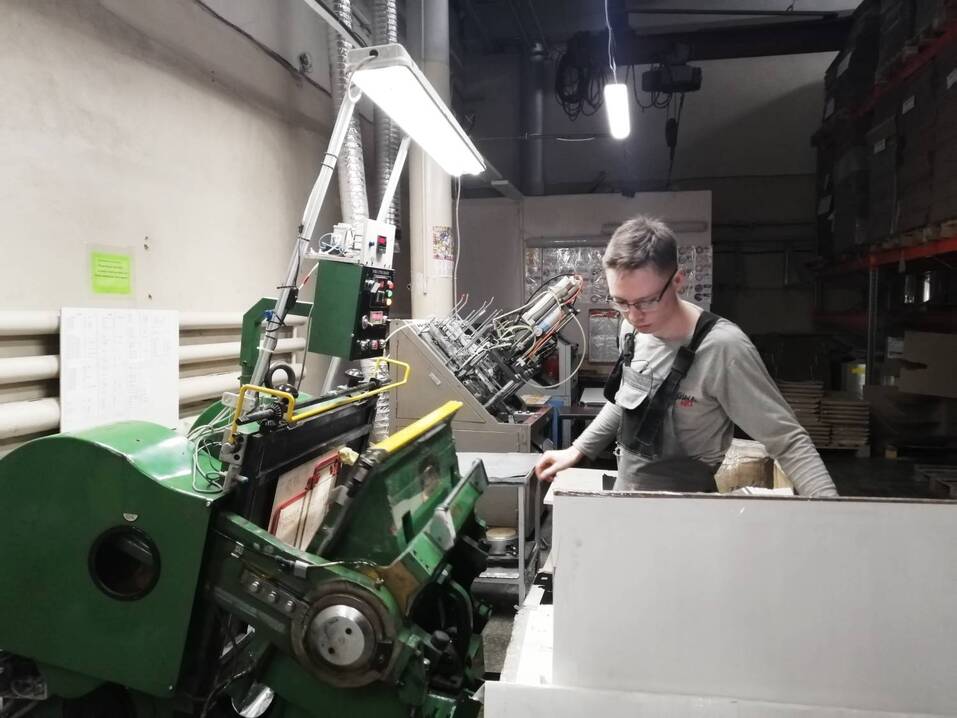Кроме этого в цехе, где делают коробки и тарелки, установили собственную флексопечатную машину. Если раньше картинку на заготовки наносили в типографии, то сейчас большие тиражи можно будет печатать прямо на предприятии. Оборудование, по словам предпринимателя, купили у одного из прежних конкурентов, который из-за неблагоприятной экономической ситуации ушел с рынка.