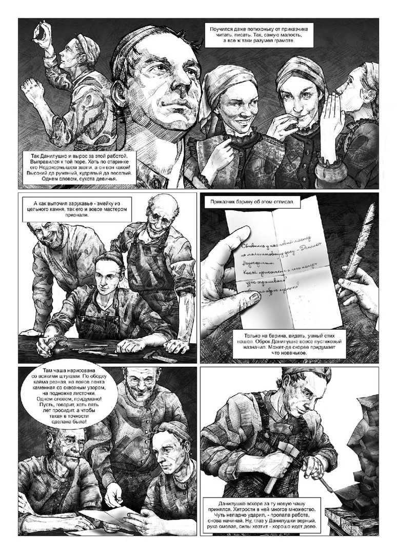 — Однажды мой друг — Георгий Григорьев, заведующий Домом-музеем имени Бажова, загрустил. У него была депрессия. А так как мы дружим с ним по Бажовским темам с 2009 г., я решила, что надо Гошу выручать. Думала-думала и придумала создать графический роман по Сказам Бажова.
