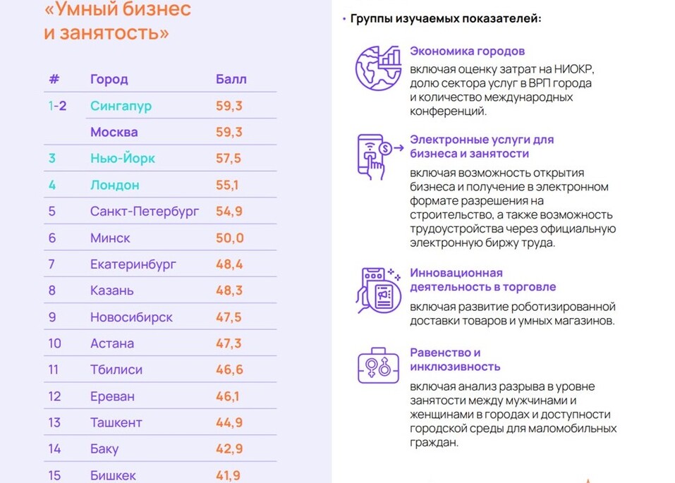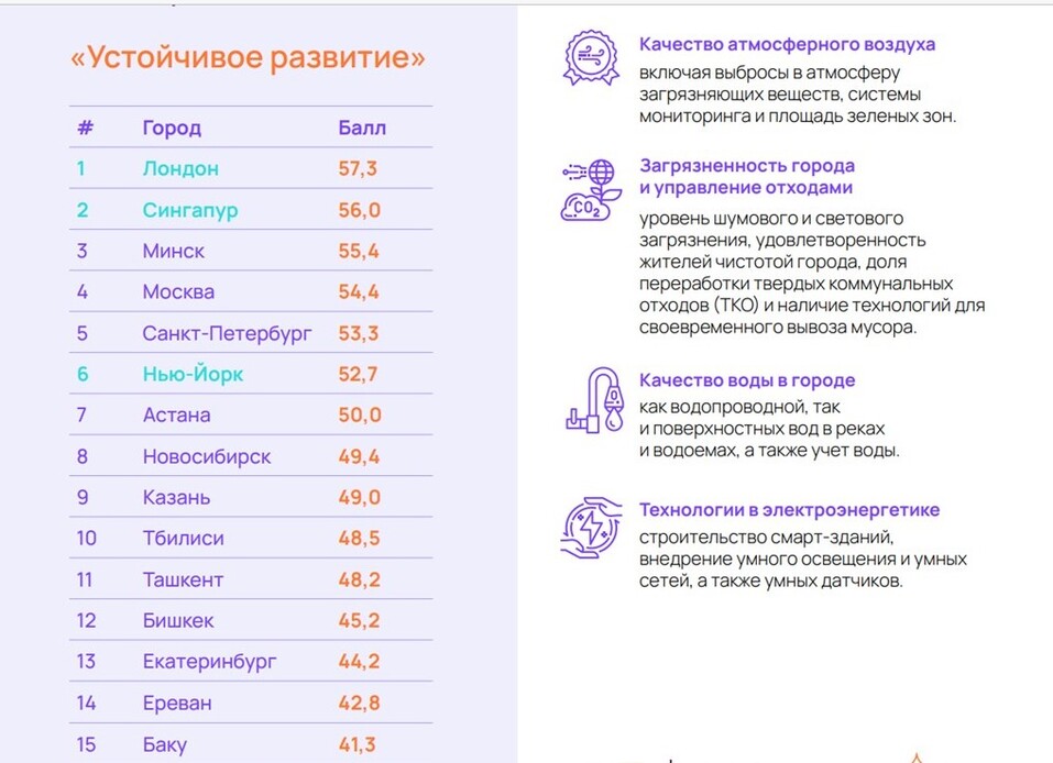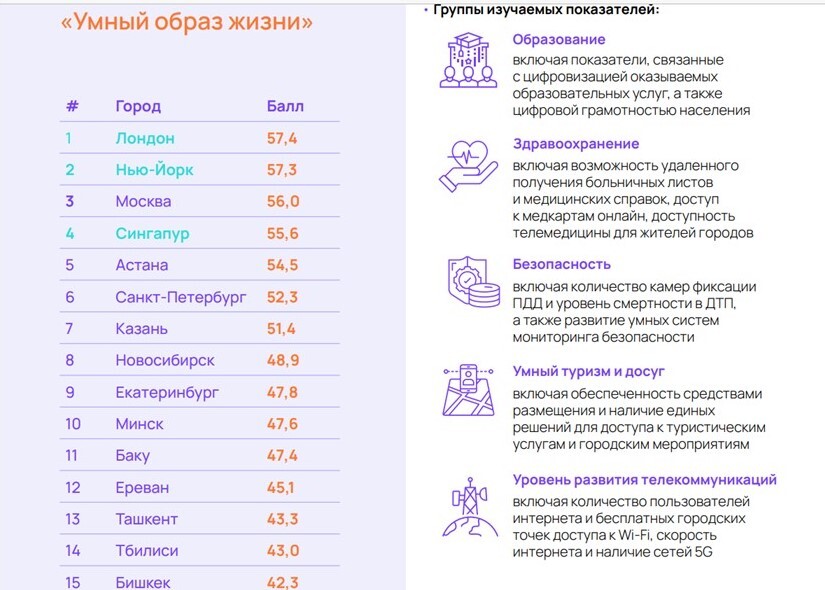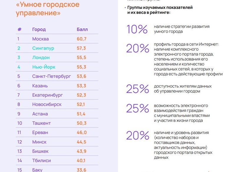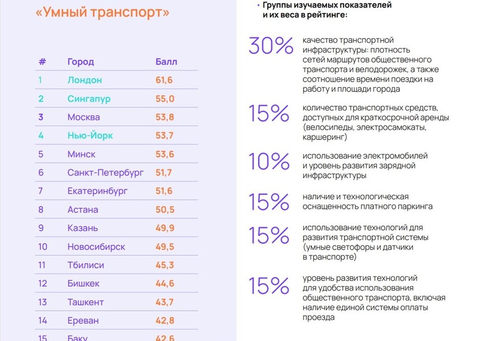 Лидерами по внедрению умных подходов и технологий являются Москва, Санкт-Петербург и Астана. Екатеринбург — на седьмой позиции. Составители рейтинга отмечают, что среди изучаемых городов СНГ и Закавказья актуальные официальные программы развития умного города действуют только в двух — Москве и Екатеринбурге. Из числа мировых мегаполисов подобные документы есть в Сингапуре и Лондоне.