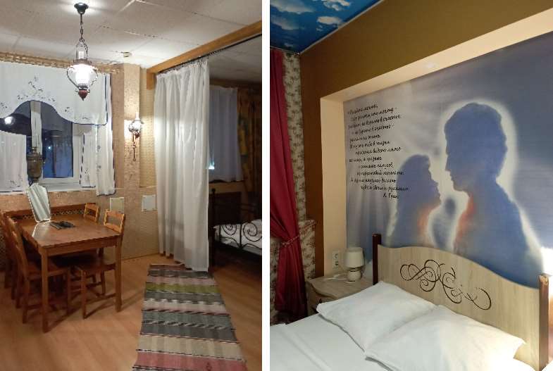 Номера стилизованы под достопримечательности Вятки. Тут и Дымковская Барыня, и старорусская изба с печкой и самоваром, и сюжеты из «Алых Парусов» Александра Грина, чьи детские и юношеские годы прошли в Вятке. В городе есть музей и набережная, названные его именем.
