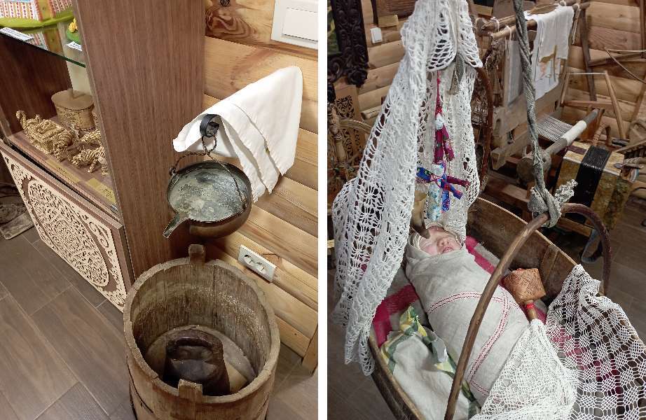 Во-дворе — «стойла для коней и постояльцев», а через несколько метров — музей истории Хлынова. История побоища XV века в Раздерихинском Овраге и праздника Свистопляски, реконструкция Кремля и оружия русских богатырей, стилизация крестьянской избы с предметами быта. Особенно понравилась мне коллекция столярного инструмента и кухонных приспособлений: например, прообраз блендера (мутовка) или водонагревателя (раскаленная в печи гиря, которую погружали в кадку с холодной водой). В центре избы — колыбелька с полешком-куколкой и берестяной погремушкой-шаргунком. Этот «набор» отводил от малыша злых духов.
