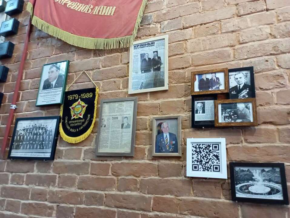 На стене размещены исторические кадры и предметы, связанные с заводчанами