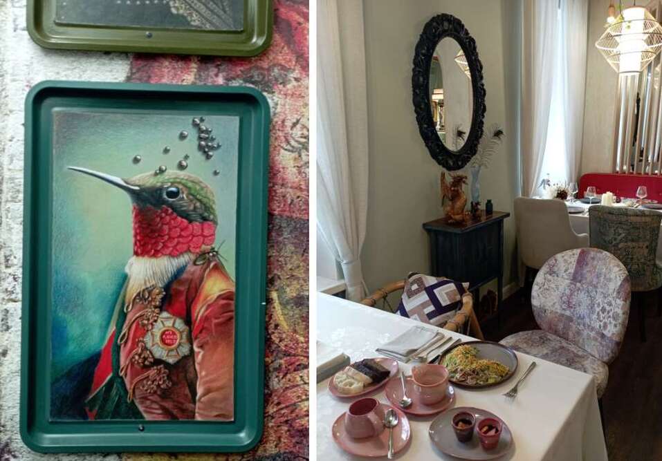 В эклектичных интерьерах заведения тоже есть что поразглядывать, но больше всего, пожалуй, выделяется «уборная». В отсеке с раковиной гостей «встречает» огромное деревянное панно с Сальвадором Дали, а когда подносишь руки к электронному диспенсеру, цифра сообщает, сколько в процентах жидкого мыла там осталось. Это удобно как для «фей чистоты», так и для посетителей.