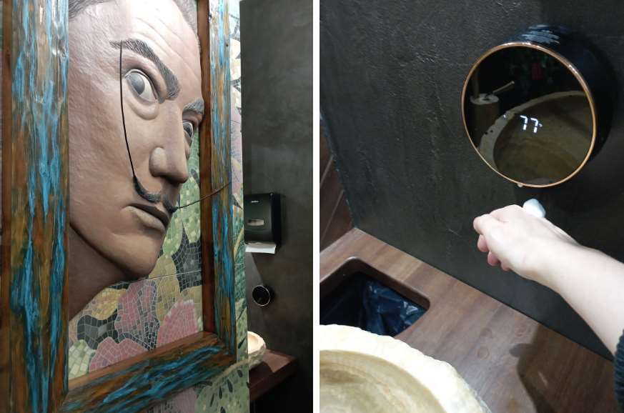 Панно с Дали и диспенсер в туалете ресторана Ойкумена