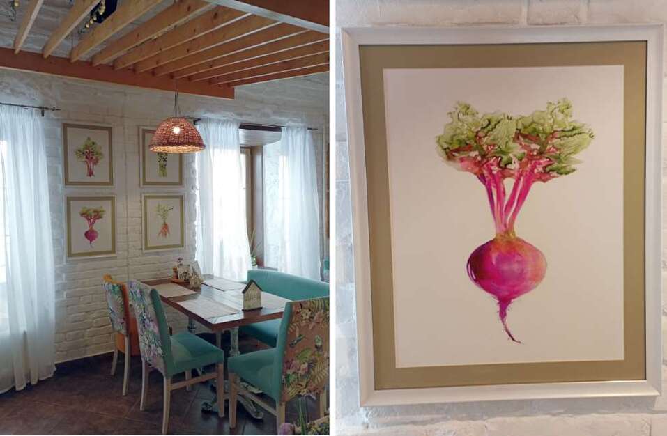 Кафе расположено в историческом здании: бывшем губернском присутственном месте, в котором служили два самых известных вятских ссыльных чиновника — Александр Герцен и Михаил Салтыков-Щедрин. Недорогие акварельные постеры «свекла» и «морковь» здорово вписаны в дачный интерьер. Меню я не отведала, но народу днем в заведении было много. Место, судя по всему, популярное. На улице перед входом — целая маркетинговая «доска почета». Фотогалерея гостей, условия доставки и гарантия подарка за оставленный отзыв. Кто хочет бокальчик вина или термос морсика?