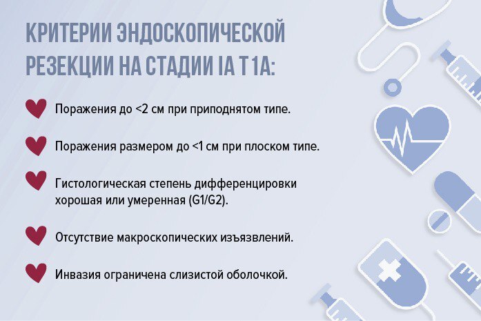 Поскольку вероятность метастазирования в лимфатические узлы при карциноме слизистой оболочки желудка (Т1а) очень мала, эндоскопическую резекцию (ЭР) можно считать достаточной. Если гистопатологическое исследование после эндоскопической резекции показывает, что опухолевая инфильтрация распространяется в подслизистую оболочку (T1b), следует выполнить хирургическую резекцию с системной лимфаденэктомией, так как метастазы в лимфатические узлы уже присутствуют примерно в 30% случаев.