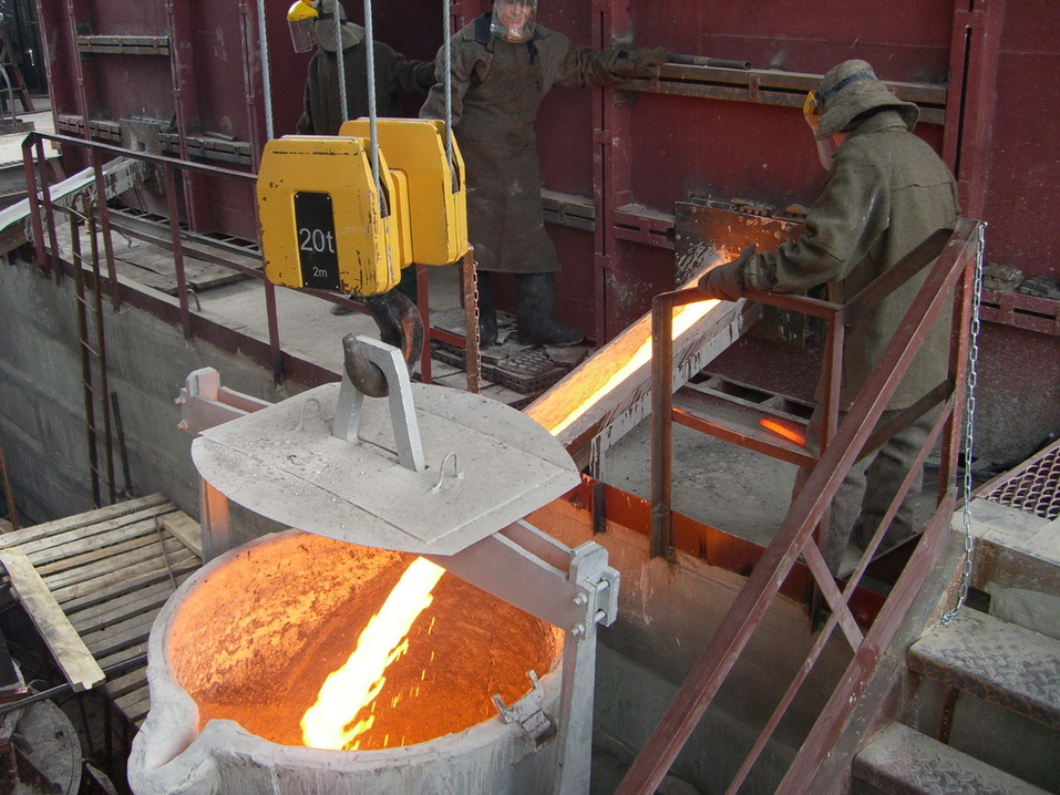 Сначала в медеплавильных печах плавят медь, затем в нее добавляют олово, перемешивают, только после этого получается заливка. Если нужно расплавить меди до трех тонн, то запускается средняя печь. Она стоит в центре цеха. Сливать медь будут в специальную емкость, которая называется «разливочный ковш». Его за петельку зацепляют на кран-балку.