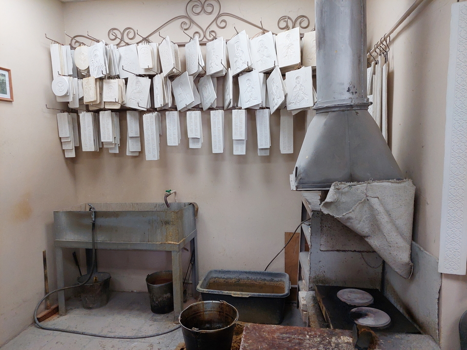 Когда восковая красота нанесена, поверхность фальшь-формы замазывают жидким гипсом. Поверх гипса одевается железная опока — конусообразная форма (в литейном производстве приспособление, служащее для удержания формовочной смеси при ее уплотнении). Когда гипс высох, форму отправляют в печь — «сушило». Во время сушки воск, успев оставить в гипсе отпечаток, стекает — вторая форма готова.