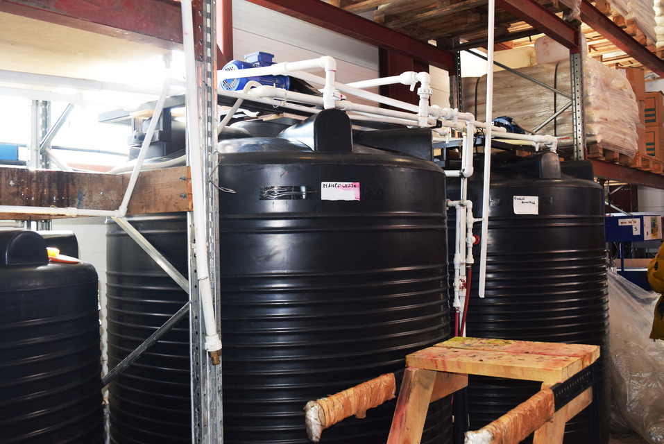 Сейчас производство моющих средств и антифризов ведется в небольшом цехе на Широкой речке. Здесь воду очищают от солей и нитритов и определенным образом смешивают в баках с этиленгликолем и химией (в случае с антифризом смесь дополнительно нагревают), а затем разливают в емкости.