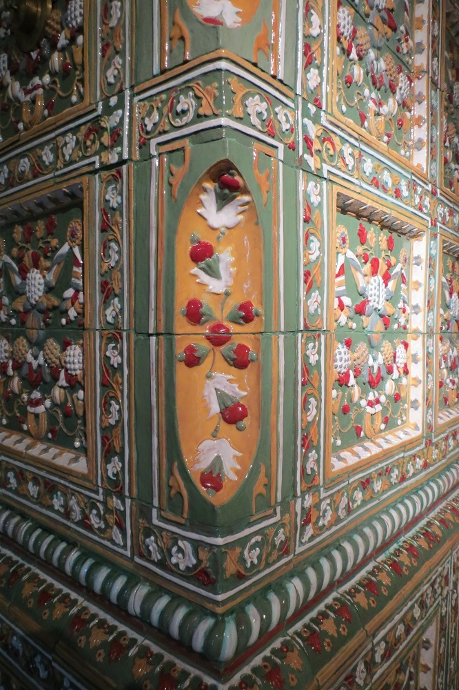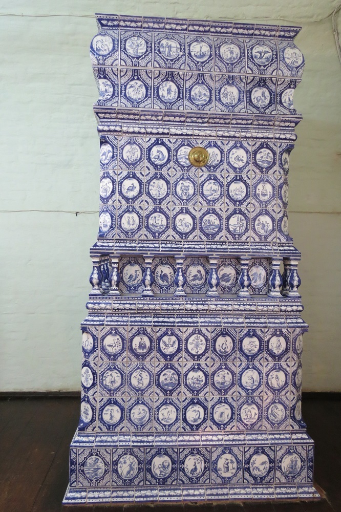 Посреди этой грубоватой брутальности в каждом зале — узорчатое чудо: изразцовая печь. Восторг! Печи явно восстановлены. Не могли же изразцы в первозданном виде простоять три столетия. Задаю вопрос единственной хранительнице музея и кассиру по совместительству. Да, все именно так.