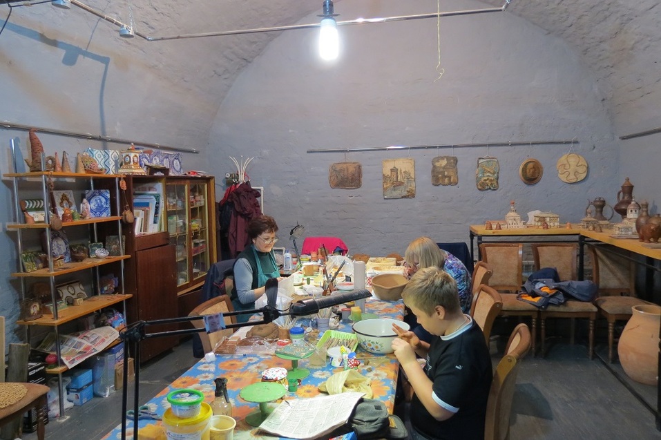 В цокольном этаже размещается керамическая мастерская. В ней работают реставраторы и к ним даже можно заглянуть. Так мы и поступаем.