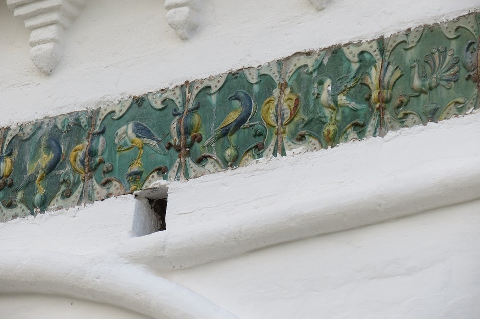 Отдельно хочется сказать об изразцах. Видеть их в качестве элементов наружного декора исторических построек у нас на Урале все-таки редкость (иное дело — Москва). Сразу же появляется предположение: не строгановские ли это изразцы?