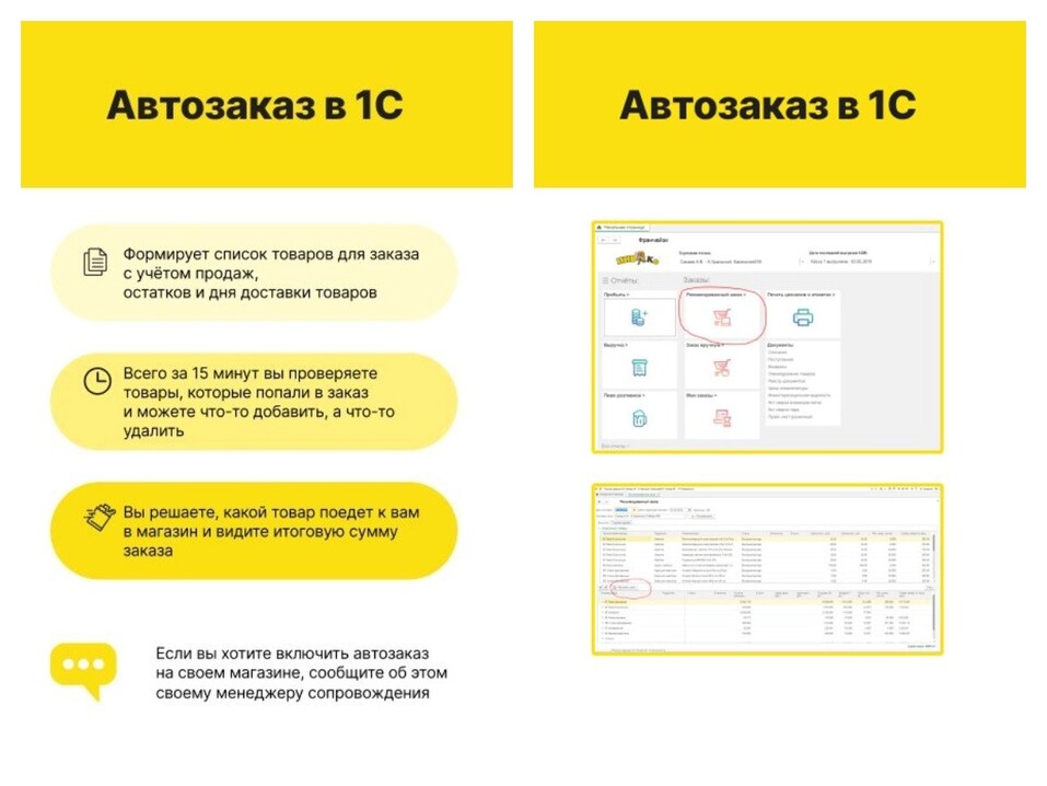 Интересной разработкой является и автоматизированная система формирования заказов на магазин. В 1С работает сервис, он составляет от лица магазина автозаказы на склады, исходя из остатков, сезонности, анализируя множество других параметров продаж. Документ заказа создается системой без участия человека. Магазину остается только в приложении «МобиД» подтвердить, когда товар поступит на торговую точку. Результат — магазины всегда с товаром, и менеджер не тратит время на заказы, а занимается главными своими задачами — повышением продаж.