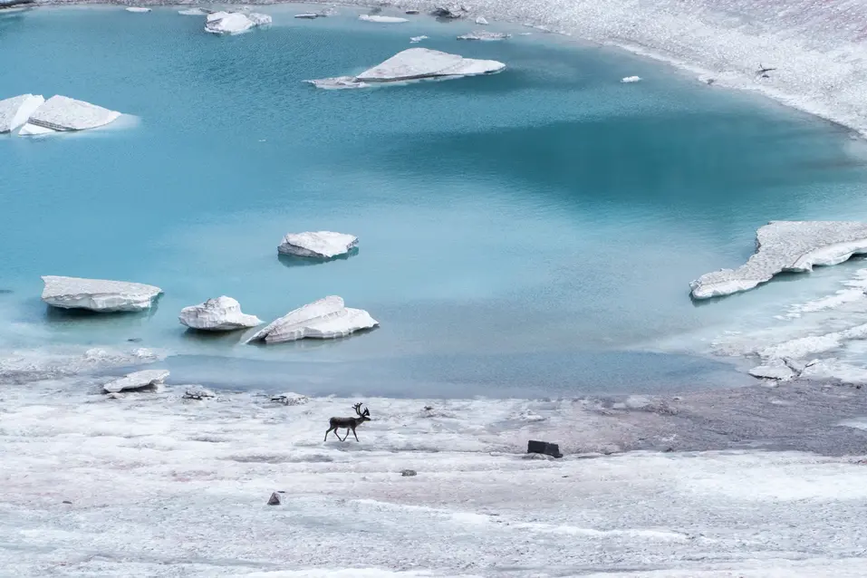 Далее на пути самый ближайший к нам ледник. От Екатеринбурга до него всего 800 км. Представляете, меньше тысячи километров на север — и мы попадаем на ледники. А если присмотреться к фотографии, можно заметить стадо диких оленей. Это уже граница Северного и Приполярного Урала.